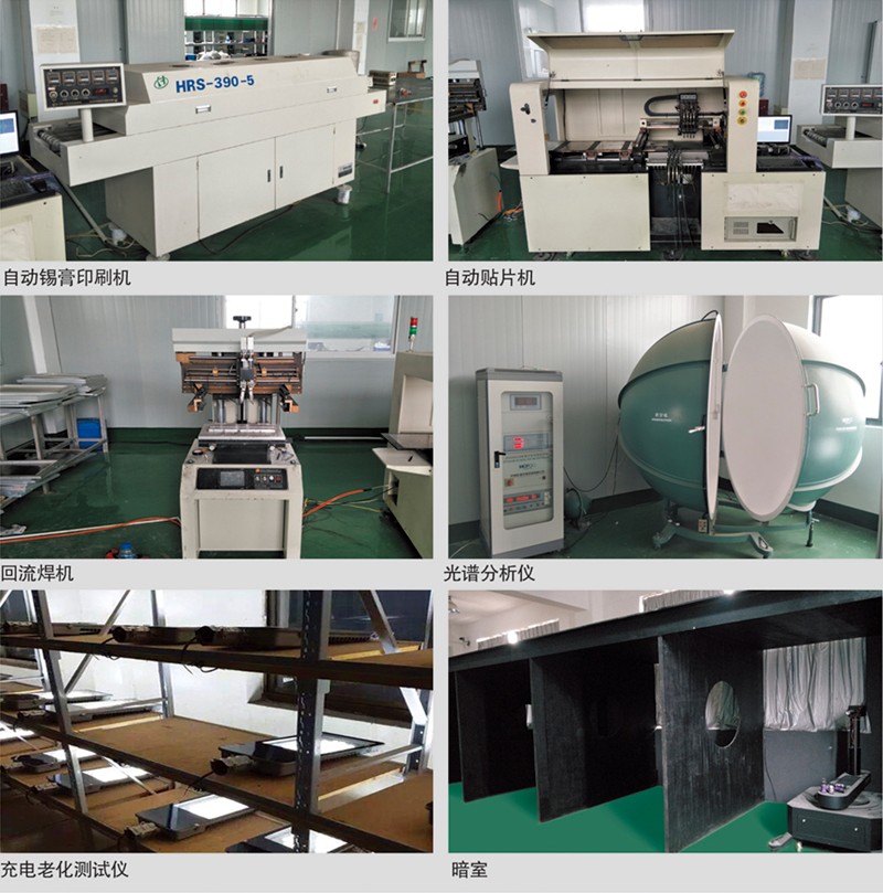 LED燈具車(chē)間擁有先進(jìn)的封裝設(shè)備,其中包括--些針對(duì)任何封裝的高功率LED光色電分檔的專(zhuān)用生產(chǎn)線(xiàn)設(shè)備,測(cè)試成品光強(qiáng),光照度的暗室以及模擬高低溫,沙塵等環(huán)境的檢測(cè)設(shè)備。所有成品都必須經(jīng)過(guò)各種檢測(cè)設(shè)備的嚴(yán)格檢驗(yàn),才可以出廠。